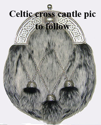 Grey dress sporran with Celtic cross cantle (Pewter top) The sporran is made with lorica and faux fur and is availble with either crossed or straight tassels.